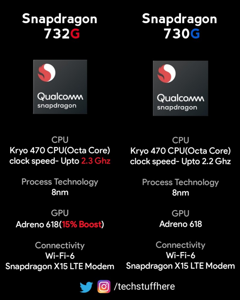 Both 730G and 732G are manufactured at 8nm, which is good. In terms of GPU, both have Adreno 618, but 732G is 15% boosted to give better gaming performance. In terms of connectivity, both have the same connectivity modems.