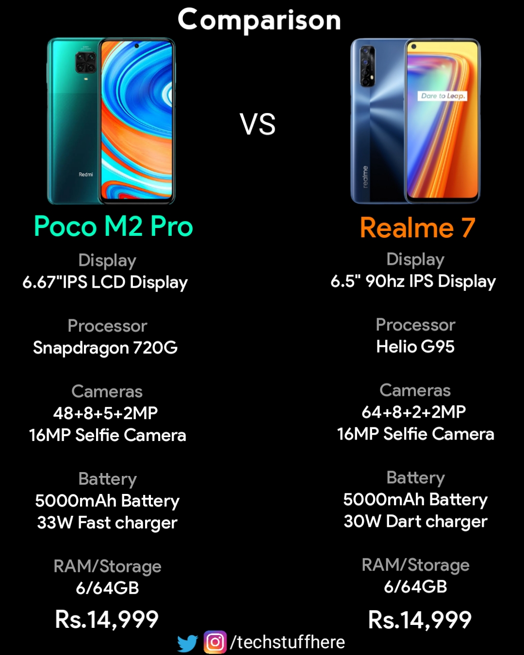 Realme and Mi are one of the most competitive brands in the smartphone market right now. At a budget of 15k, Mi offer Poco M2 pro and realme offer newly launched Realme 7. From specs perspective, realme 7 is the clear winner here. Software is the department where you should decide which phone to buy. On one side, Poco M2 pro has glass back and Realme 7 has plastic back, so it depends on preference. If you are thinking about processor, 720G on Poco m2 pro is more efficient and G95 on realme 7 is a bit more powerful. In terms of camera, realme 7 has much capable camera. Check out reviews and choose wisely.