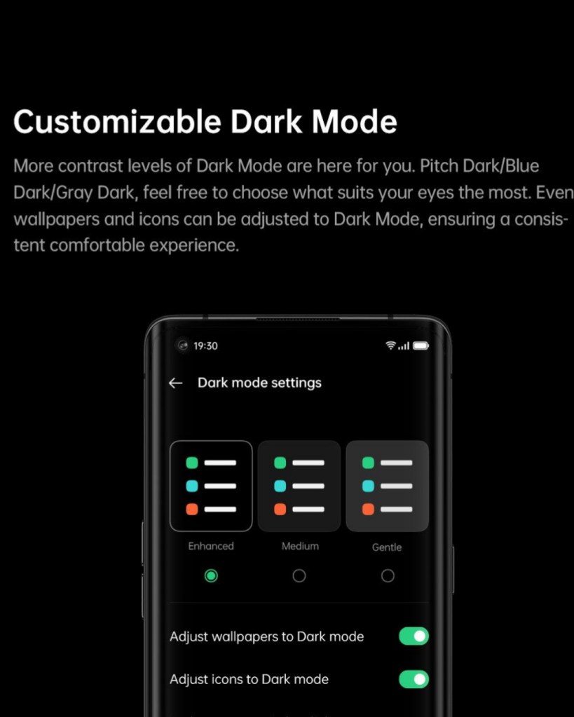It also has a different dark modes. We can adjust different tones of darkness which is pretty cool. We also get option to adjust wallpapers and icons to dark mode.