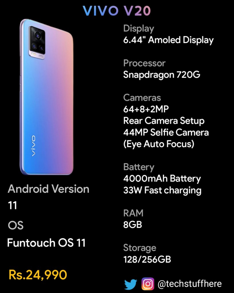 In the category of camera, Vivo has put a high resolution 44MP selfie camera to the front, which is really great. In terms of rear camera, it has a 64MP main camera, 8MP Ultra-wide and 2MP macro. It is also the first smartphone to have Eye Auto Focus, which is a new tech by Vivo in the replacement of the Face Auto focus, which is really good for focusing. It also has many cool camera centric features and it also has dual video recording, which can come in handy. Vivo is known for having good camera’s, so we can expect class leading camera at its price.