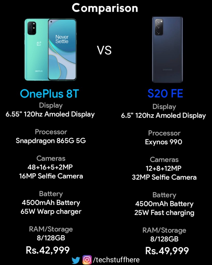 These both are one of the most popular phones arround 40k to 50k. Samsung unvealed Samsung S20 FE with the specs which fans are interested in to keep the cost low. On the other hand OnePlus 8T is the new flagship killer from OnePlus. It brings some cool specs. Lets see how they both compare.