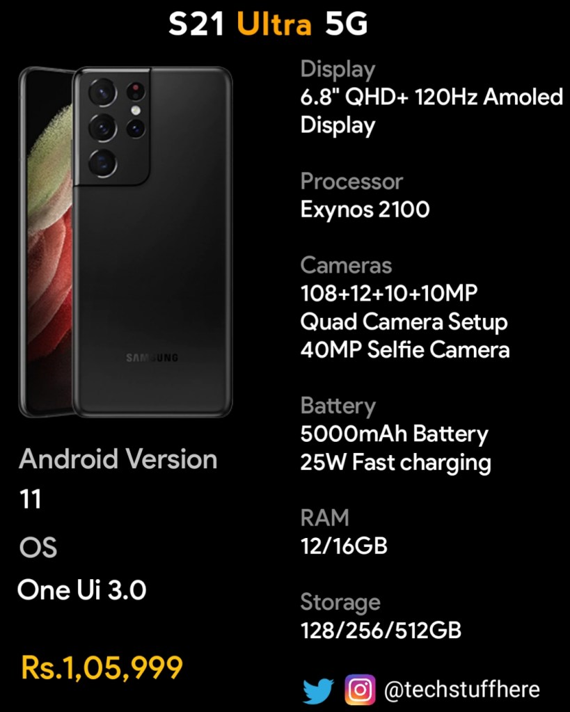 Processor: Exynos 2100 ( India and some regions), Snapdragon 888 ( USA and some other regions)