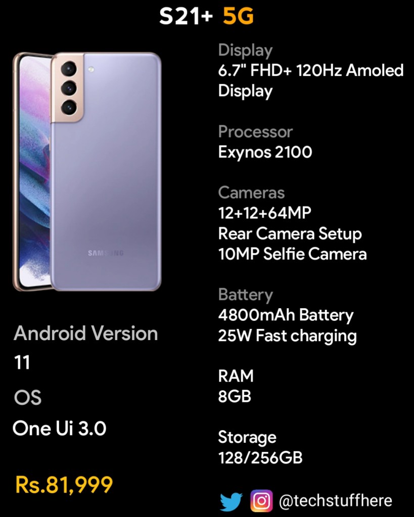 Samsung launched 2021’s new S-series flagship’s. They have gone with new design and made a lot of changes in processor segment and a lot. They launched three new S-series flagship’s, namely S21, S21+ and S21 Ultra. Lets see what specs it brings.